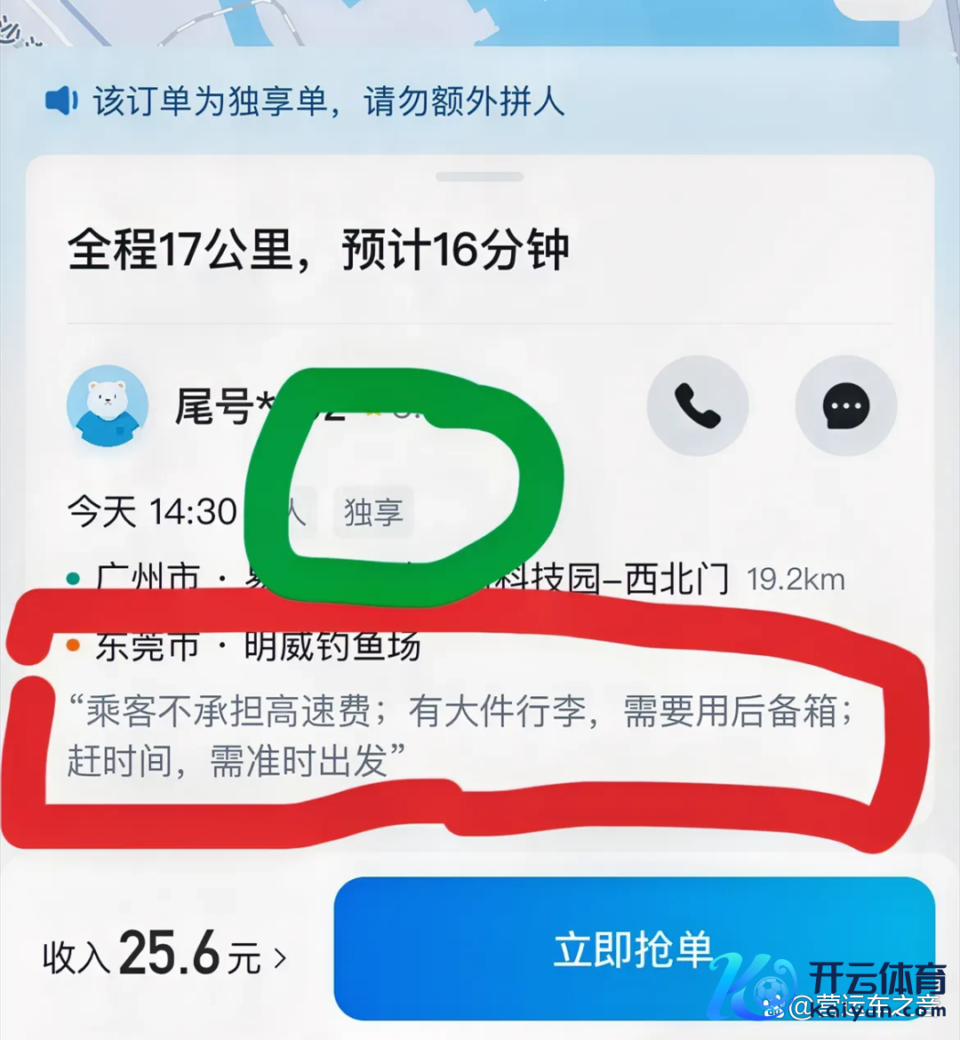 比如,像底下这么一笔顺风车订单,全程17公里,司机收入25.6元的独享订单,乘客明确备注:不承担高速费;有大件行李,需要用后备箱;赶技能,需准时启程。